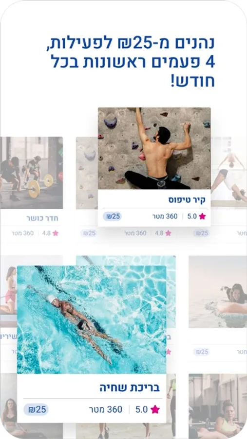 מזמינים אותך ל-2 שיעורי ניסיון מתנה, ועוד 4 פעילויות בחודש ב-25₪ לפעילות במקומות הכי שווים.