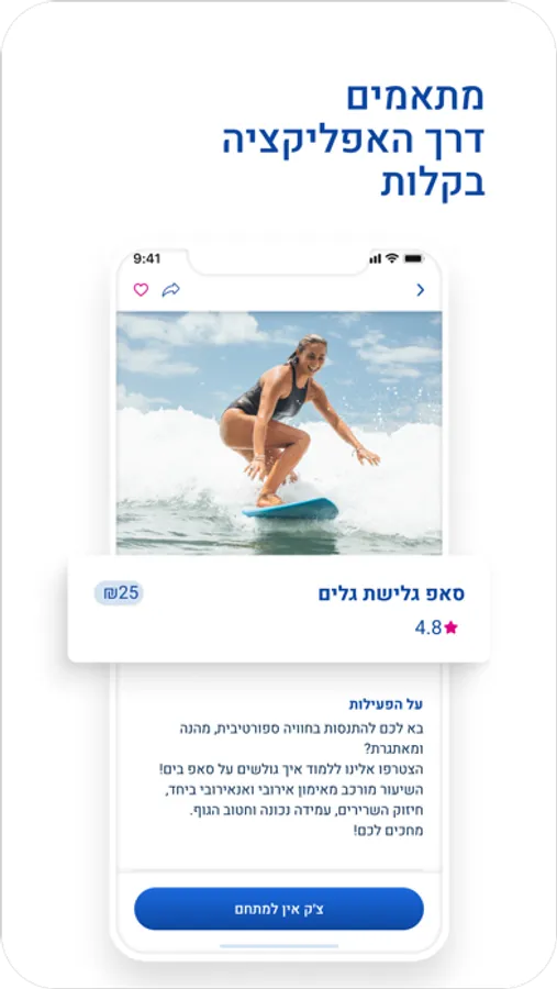 איזה פעילויות? רק תבחרו! אימוני כוח, אירובי, גלישה ואימוני אונליין ללא התחייבות - בקלות ובמהירות, ישירות דרך האפליקציה!