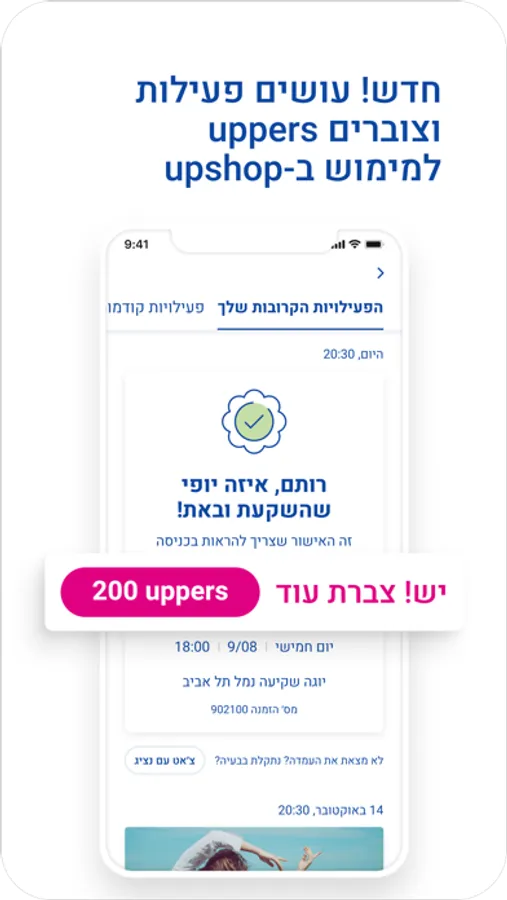 upshop, חנות עם מגוון סדנאות בריאות, מוצרי ספורט והטבות שוות במיוחד. מהיום על כל פעילות שתעשו, תצברו uppers אותם תוכלו לממש בחנות.