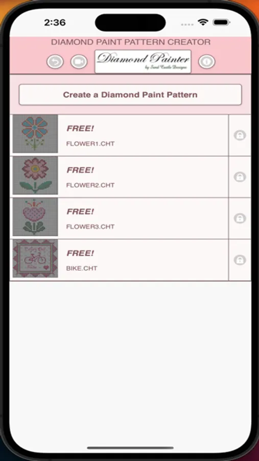 Comes with 4 sample diamond patterns. Download is free. To activate is $2.99.