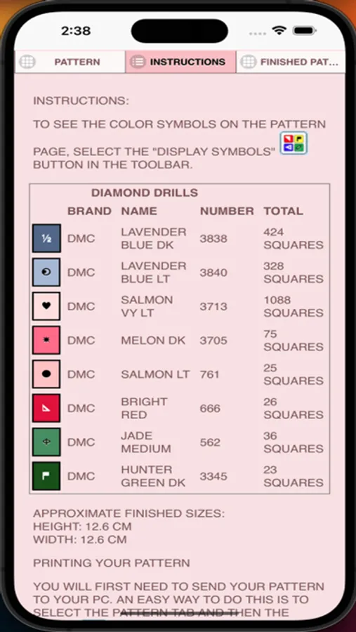 Instruction page - displays the DMC Diamond colors used and finished size.