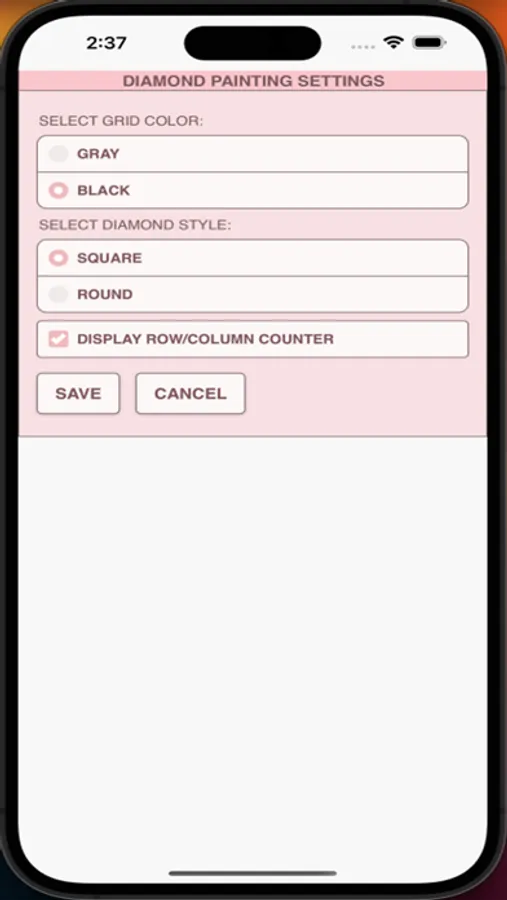 Option settings - change the grid color, change diamond shapes (squares or circle), select not to display the row/column counter.