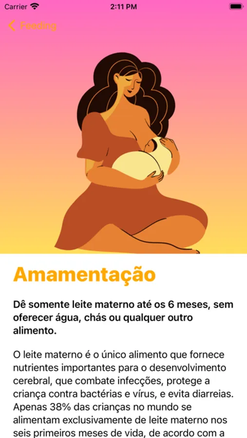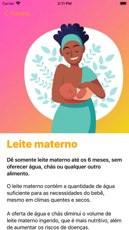 Se você está passando por essa fase, recomendamos o Feeding, um app que oferece vários artigos com orientações sobre amamentação (leite materno ou fórmula), cuidados com recém-nascidos, alimentação para crianças de 6 a 24 meses, vitaminas importantes e consultas necessárias. Esses artigos podem ajudá-lo(a) no dia a dia com seus cuidados com o bebê.