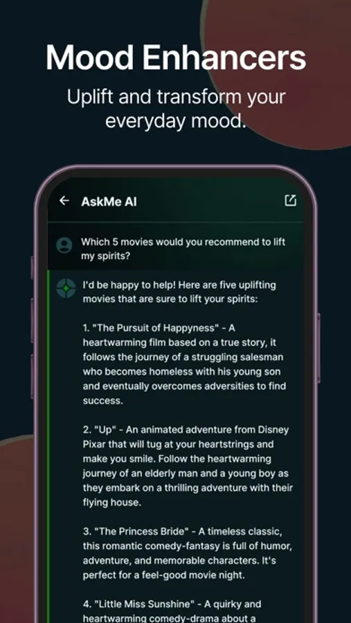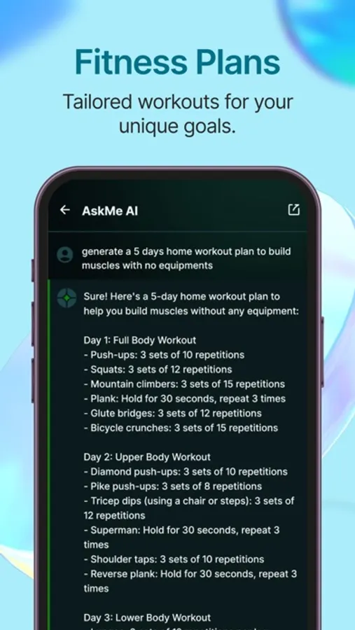 Empower Your Curiosity with AskMe Unleash the potential of our AI chatbot, designed not just to answer, but to enlighten. Dive into a reservoir of insights, recommendations, and creativity. Whether it's a tailored gym routine, a fresh business strategy, or a savory recipe, AskMe is your ultimate guide.