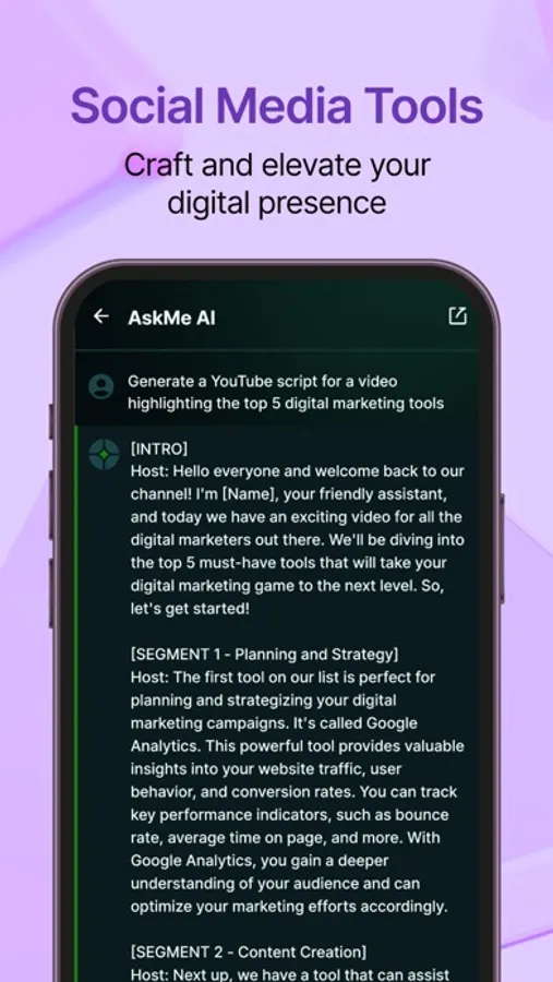 Our AI generator chatbot isn’t just about answering; it’s about empowering. Whether you're a student, a professional, a creator, or merely curious, AskMe ensures you grow, learn, and become better. From crafting compelling content to understanding intricate concepts, with AskMe, clarity is just a chat away.