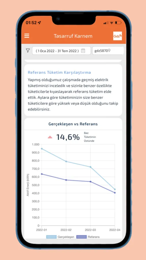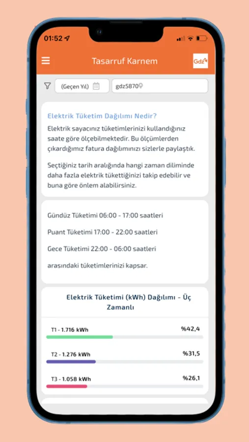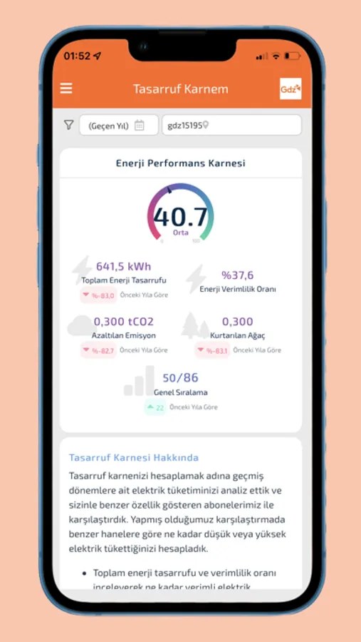 Gdz Enerji Karnem uygulaması Gdz Elektrik abonelerinin elektrik tüketimlerini takip edebildikleri, ayrıca kendilerine özel hazırlanmış elektrik tüketim analizleri ve tasarruf tavsiyelerine erişebildikleri bir uygulamadır. Uygulama sayesinde geçmiş tüketimlerinizi takip edebilir ve sizin için hesapladığımız enerji verimliliği karnenizi inceleyerek diğer hanelere göre enerji kullanımınızı karşılaştırabilirsiniz.