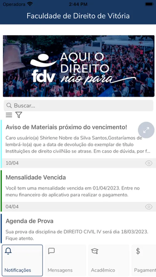 Serviços acadêmicos e financeiros. Alunos têm acesso a comunicados, notificações, notas, frequência, extrato financeiro, negociação online, ocorrências, quadro de horários e muito mais.