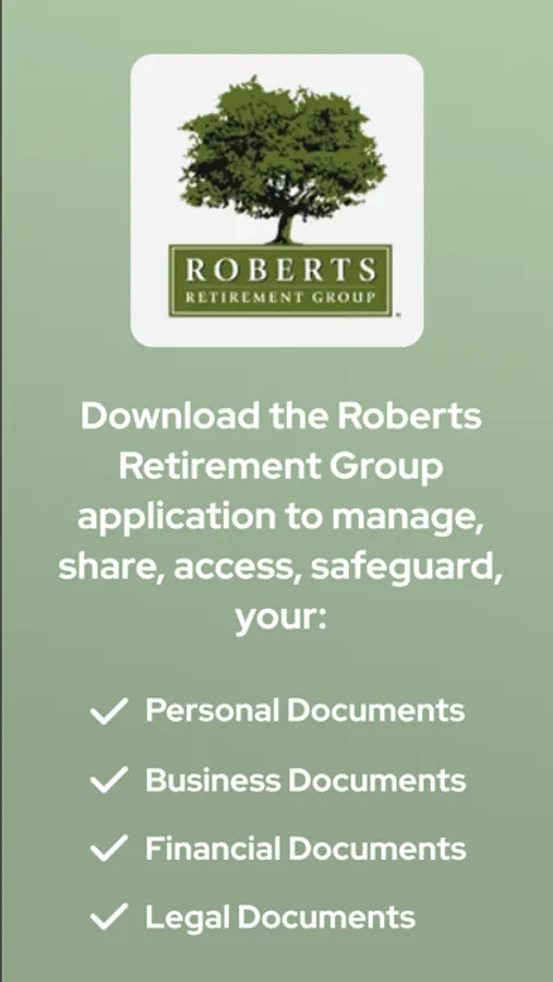 By accessing your personal Roberts Retirement Group Vault, you can easily (and securely) access, store, and manage your personal, financial, and business documents on the go, 24/7. Your personal Vault will allow you to receive and share critical documents and information securely with the Roberts Retirement Group team, giving you the peace of mind you deserve.