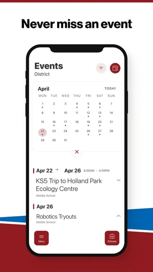 The event section shows a list of events throughout the district. Users can add an event to their calendar to share the event with friends and family with one tap.