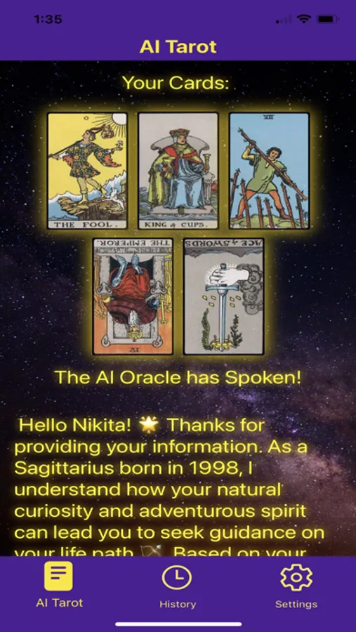 To further enhance your experience, our app features an optional Personal Insight Form. This form allows you to share your details, enabling our AI tarot oracle to deliver even more precise and tailored descriptions. In addition, the app keeps a record of your past queries, allowing you to reflect on previous readings and track your spiritual journey.