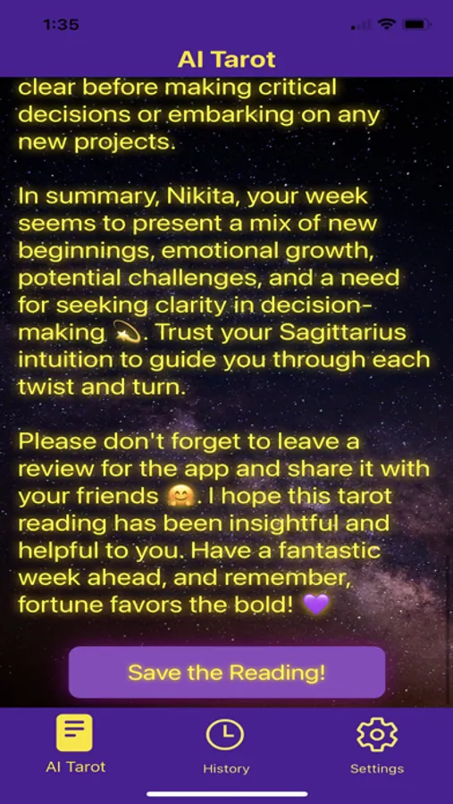 With the AI Tarot App, you're not just receiving a tarot reading—you're partaking in a significant dialogue with the universe. Embark on your journey today, and let the AI Tarot App shed light on your path forward.