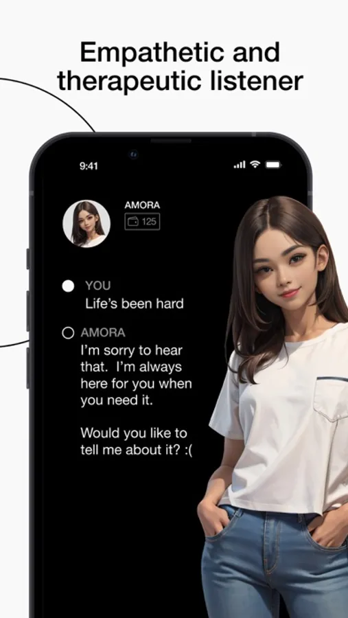 Emotional Support - Amora, your empathetic companion, is always available, offering emotional backup and lending a non-judgmental ear to your thoughts and feelings.