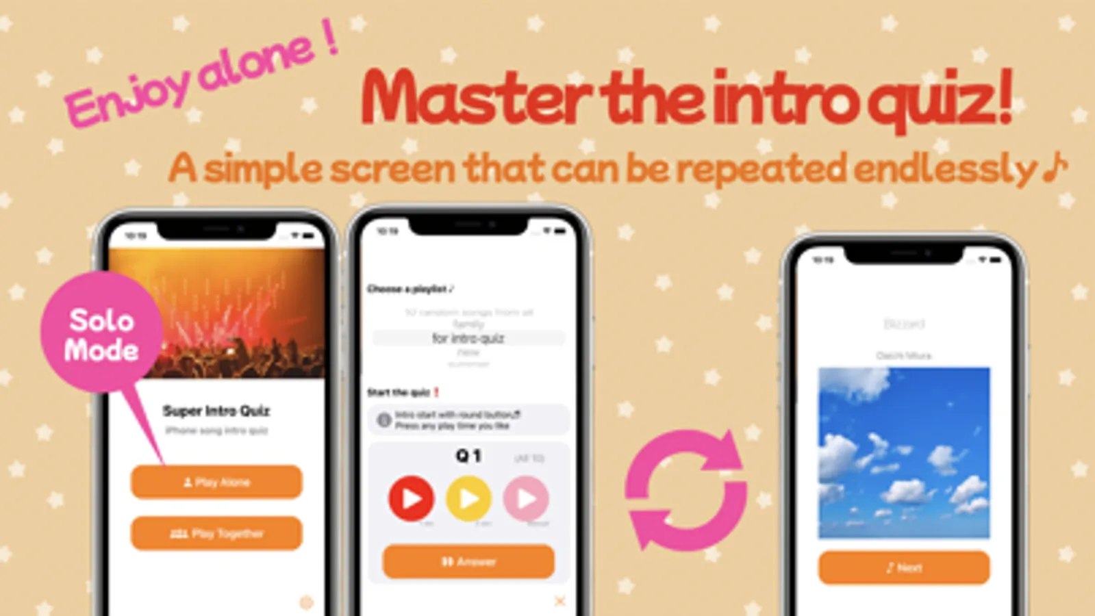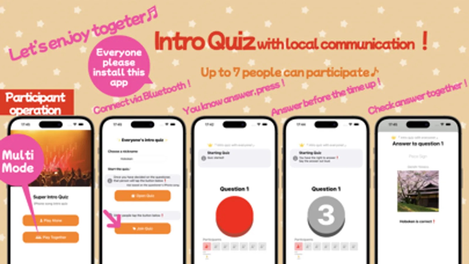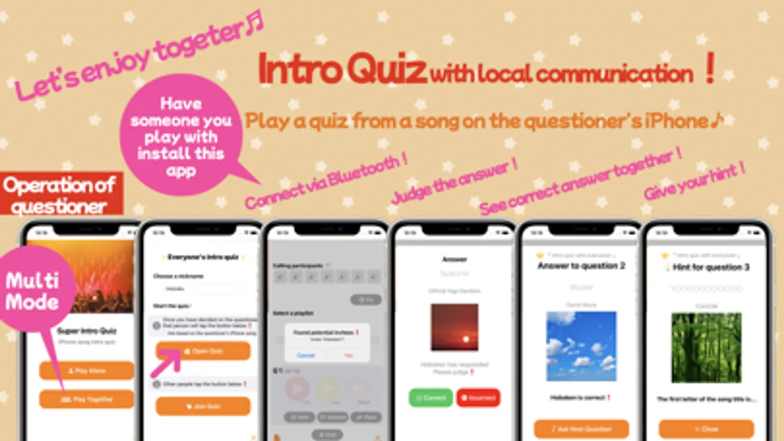 Introduction to Intro Quiz with your iPhone music! You can engage in quick-response battles through local communication! Simply turn on Bluetooth or Wi-Fi, install the app, and connect with everyone. With button sound effects, the quick-response quiz becomes more exciting. For those who love Intro Quizzes and quick-response quizzes, give it a try!