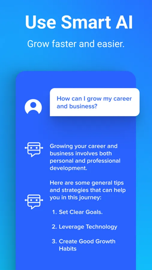 - Get Your Questions Answered: Our AI chat bot is like a personal assistant that's always available to help you. It can answer your questions and provide you with actionable insights to help you grow in life, career, and business.