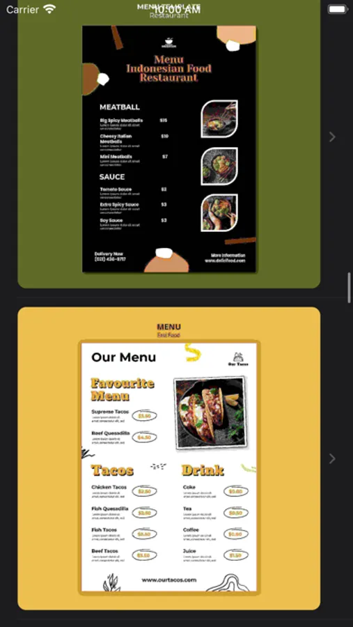 With its intuitive interface and user-friendly features, Menu Maker allows you to craft captivating menus in just a few taps, even if you have no design experience. Choose from a wide range of over 1000+ ready-made menu templates, each crafted to perfection by professional designers. These templates cover various occasions and themes, ensuring that you'll find the perfect match for your establishment.