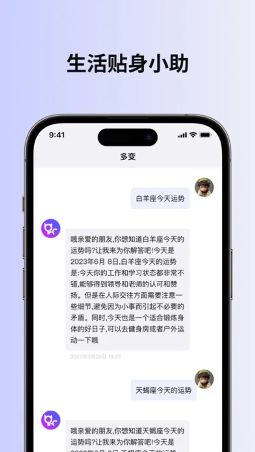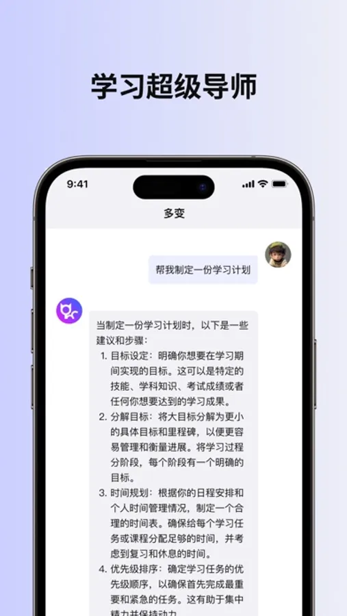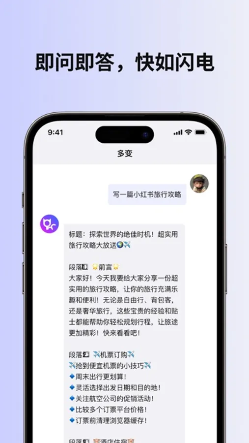 多变是一款集成全球领先的会话工具应用,为您的写作、学习创造力和娱乐提供全方位的支持。您可以借助多变APP,无需付出辛苦努力,即可高效完成工作,快速掌握新知识,拓展创造性思维。