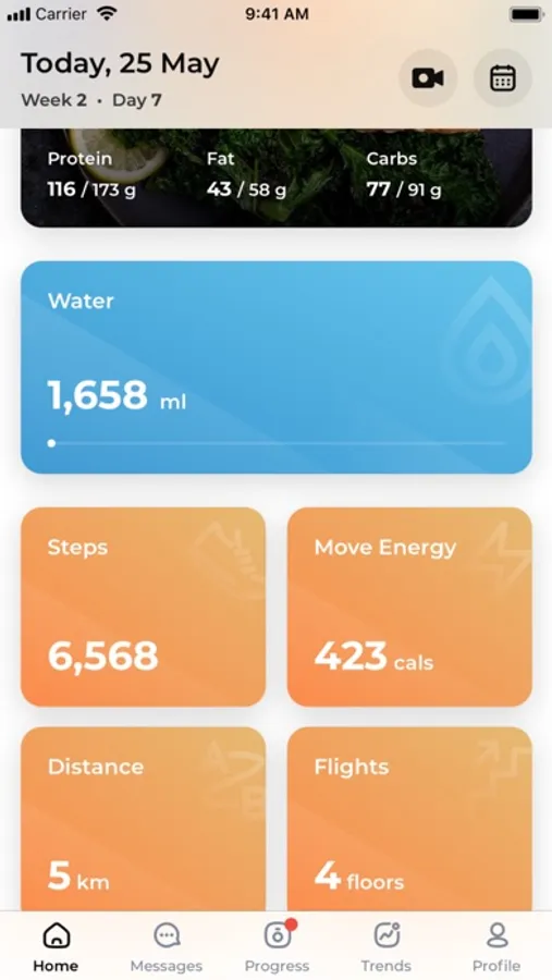The app integrates with Apple Health to show your daily activity - distance, steps, active energy, and flights to help you better achieve your goals.