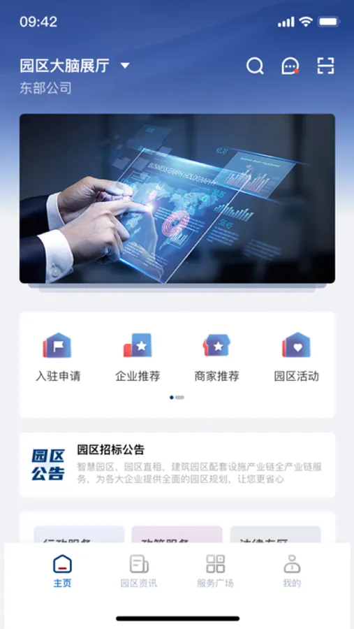 园区大脑+APP是一款为入驻园区的企业和个人用户提供智能化服务的平台, 作为面向客户、入驻企业、员工的移动端服务接触点,提供即时便捷的移动服务,包括园区的资讯、互动、招商入驻、活动申请、在线看房等功能,基于手机操作习惯设计,提高服务覆盖率和用户体验度。