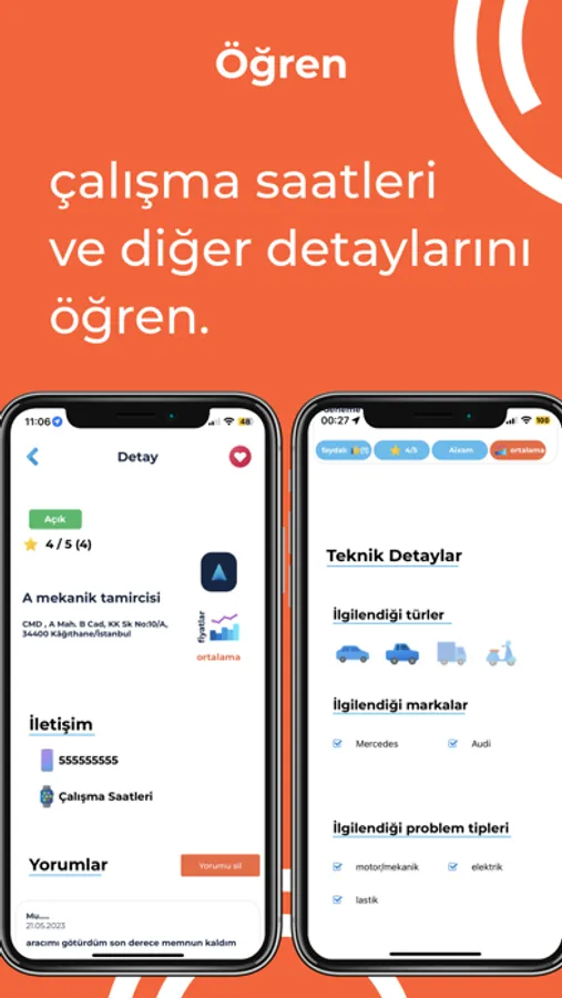 - Tamircilerin Açık/Kapalı durumlarını görebilir dilersen tüm çalışma saatlerine göz atabilirsin.