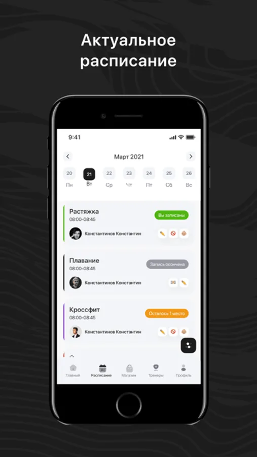 Посмотреть актуальное расписание тренировок и информацию о тренерах;