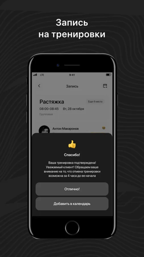 Получать PUSH-уведомления о предстоящей тренировке, окончании абонемента и др.