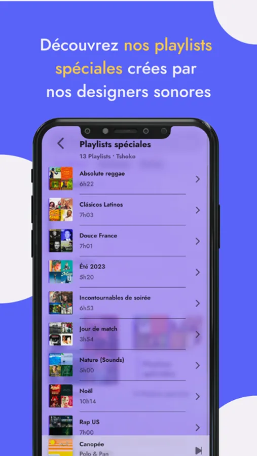 • Naviguer entre les playlists d'ambiances / spéciales : sans aucun algorithme, notre équipe de designers sonores édite des playlists d'ambiance qui s'adaptent à vos ambiances sonores (Zen, Chill, Pop/Rock, Soul/Funk, Jazz…) et aux événements (Noël, été…).