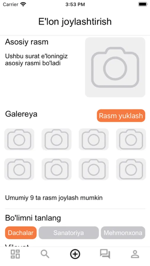 Ilova haqida malumot Bu ilovadan asosiy maqsad e'lon yuklash va yuklangan e'lonlarni ko'rish va ular haqida barcha malumotlarni bilib olish va buni orqasidan odamlar uchun yengillik va qulaylik yaratish uchun ishlab chiqilgan. Bu ilovada asosiy 4 ta bo'lim mavjud, bu bo'limlar Dacha ijarasi, Mehmonhona ijarasi, Sanatoriya ijarasi, Uy va dacha savdosi va Xizmatlar bo'limi. Yuqorida aytilganidak bu bo'limlardan istaginingizga e'lon joylashingiz va istalgan bo'limdagi e'lonlarni ko'ra olishingiz mumkun. E'lon joylashda siz 9 ta rasim yuklashingiz, e'lon uchun nom berishingiz, kerakli bo'limni tanlashingiz, xarita orqali manzilni aniq belgilashingiz, band qilingan kunlarni kalendar orqali belgilab qo'yishingiz, qulayliklar haqida yozishingiz, mehmonlar soni haqida malumot berishingiz, dollor yoki so'mda narx belgilashingiz va oxirida esa e'loningizni ilovaning qaysi joyida ko'rinishini istasangiz o'sha joyiga ko'tariladigan qilib reklama turini tanlab reklama qilsangiz bo'ladi.E'lonni ichiga kirganingizda esa e'lon joylashgan manzilni xarita orqali ko'rish, qulayliklar haqida bilish, band qilingan kunlarni kalendar orqali ko'ra olish, e'lon beruchining qolgan elonlarini ham ko'ra olish, e'lonning rasimalrini yaxshiroq ko'ra olish va narxlarni bilib e'lon beruchiga qo'g'iroq qilishingiz yoki bo'lmasa ilova orqali xabar yozishib gaplasha olishingiz mumkun. Xizmatlar bo'limida esa foydalanuchilar uchun yana ham qulayroq bo'lishi uchun tozalash, yetqazib berish, taxi va hokazo xizmatlani ko'rish va buyurtma qilishlari uchun qilingan.Xizmatlar bo'limiga xizmatingizni joylash uchun Adminga aloqaga chiqishingiz kerak bo'ladi.Yana bu ilovada foydalanuchi uchun e'lonlarni qidish va saralash imkoniyati ham mavjud.Bundan tashqari ilovada bir qancha qulayliklar mavjud, bulardan1) Ilovadan uch xil ENG, RUS, UZB tillarda foydalana olish.2) Faydalanuchu uchun alohida profil yarata olish.3) O'zingiz uchun shaxsiy hisob yarata olish.4) Dasturning qullab quvvatlash bo'limidagilar bilan aloqa qila olish.5) Reklama xizmatlari haqida yaxshiroq malumot olish.6) Yuklagan e'loningizni istalgan vaqtda tarifini yoki o'zini tahrirlay olish.7) Profilingizdan chiqishingiz yoki bo'lmasa profilingizni o'chirib tashlay olish.8) Profilingizga Isim familya va rasim yuklash va bu malumotlarni istalgan vaqt tahrirlay olish.9) Profilingiz uchun parol qo'yish va bu qo'yilgan parolni istalgan vaqtda tahrirlay olish.10) Ilovaga ro'yxatdan o'tmasdan ham e'lonlarni ko'rish uchun ilovaga mehmon bo'lib kira olish.Ilovadan ro'yxatdan o'tish vaqtida sizdan telefon raqam kerak bo'ladi.Eslatma: Agar profilingizni behosdan o'chirib tashlasangiz qo'llab quvvatlash xizmatiga aloqaga chiqib profilingizni qaytarsangiz bo'ladi.