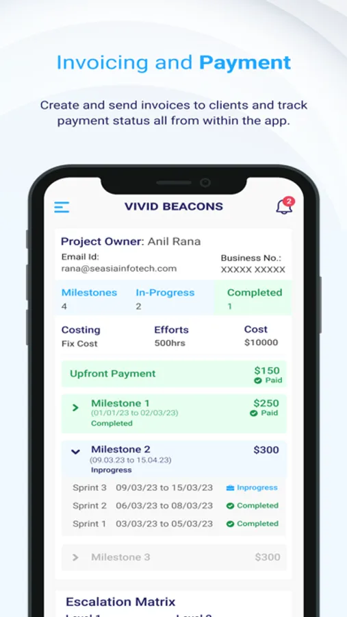 • Invoicing and payment tracking: Create and send invoices to clients and track payment status all from within the app.