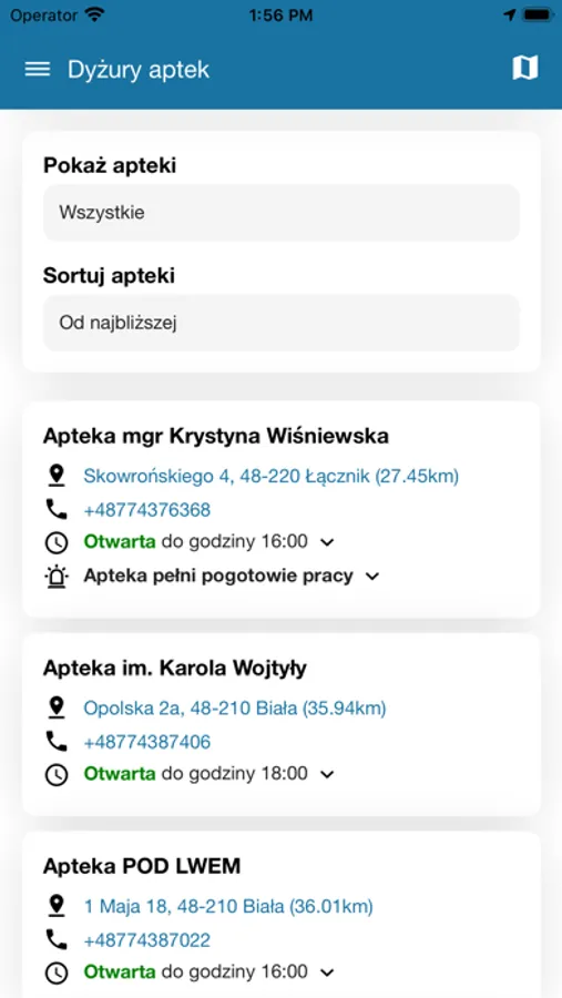 Aplikacja umożliwia sprawdzenie godzin otwarcia i dyżurów aptek w powiecie, dzięki czemu zawsze będziesz miał dostęp do aktualnych informacji. Moduł dyżuru aptek umożliwia filtrowanie, sortowanie i lokalizowanie aptek w zależności od Twoich potrzeb. Przejrzysta mapa pokazuje położenie każdej apteki, a także umożliwia wyznaczenie trasy do wybranej przez Ciebie placówki.