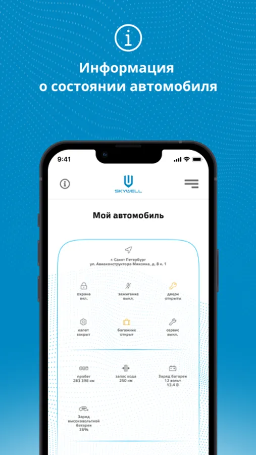 - получить информацию о состоянии автомобиля: уровне заряда аккумулятора и батареи, запасе хода, пробеге, скорости, состоянии дверей, капота и багажника