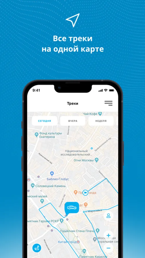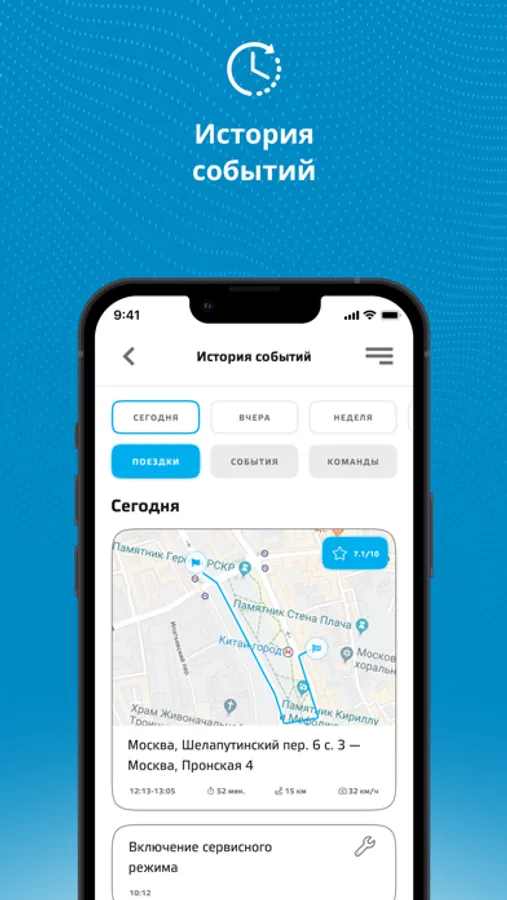 - просматривать историю поездок и всех событий на маршрутах автомобиля
