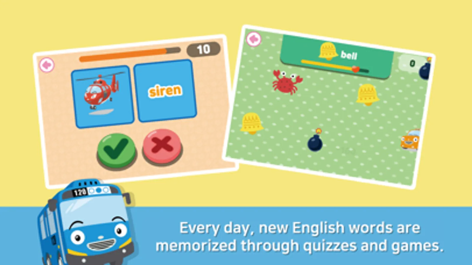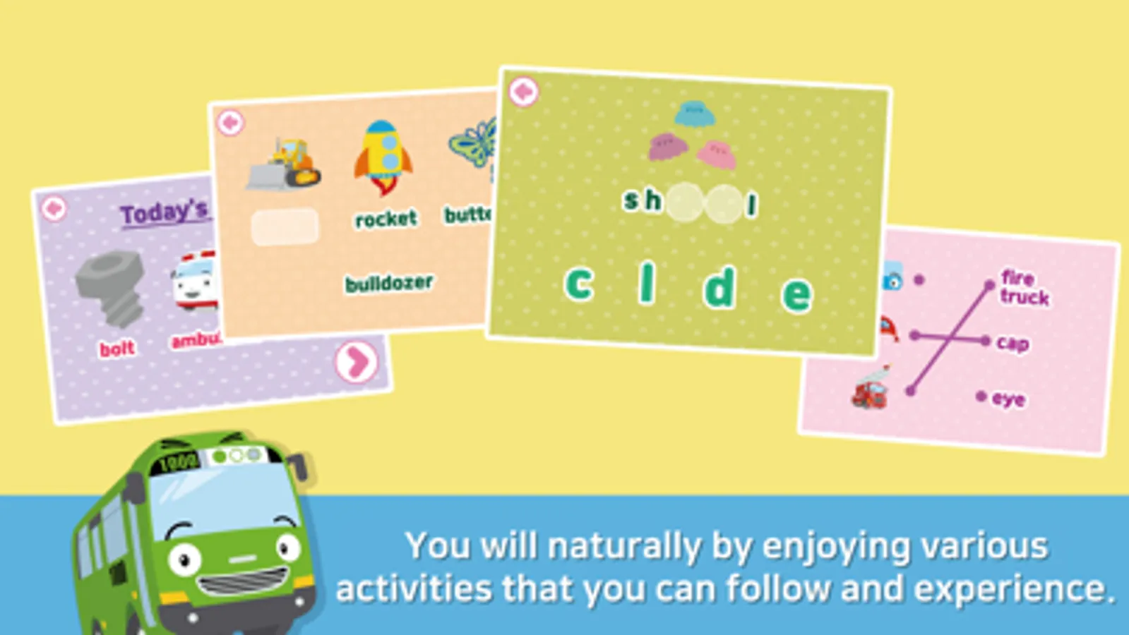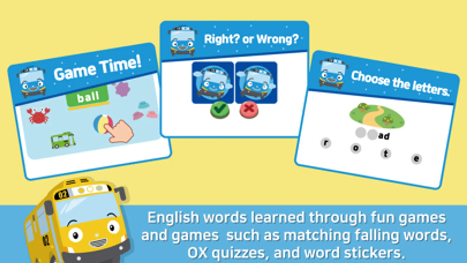 - Play English words with various characters such as Tayo, Rani, Rogi, and Gani