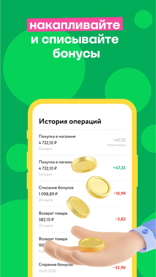 Вообще всех, а не только покупок и возвратов за рубли. Например, в приложении можно смотреть все списания и начисления бонусов. Нашим покупателям доступно всё, что происходит с их бонусами и деньгами в «Ещё».