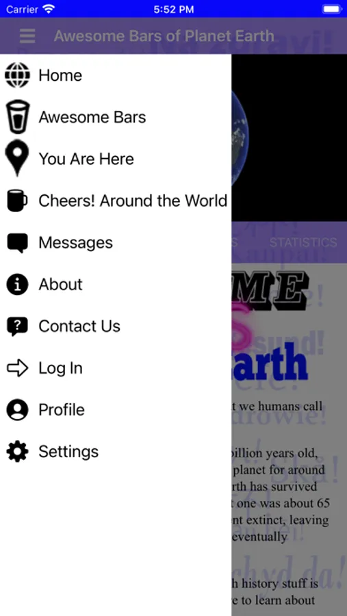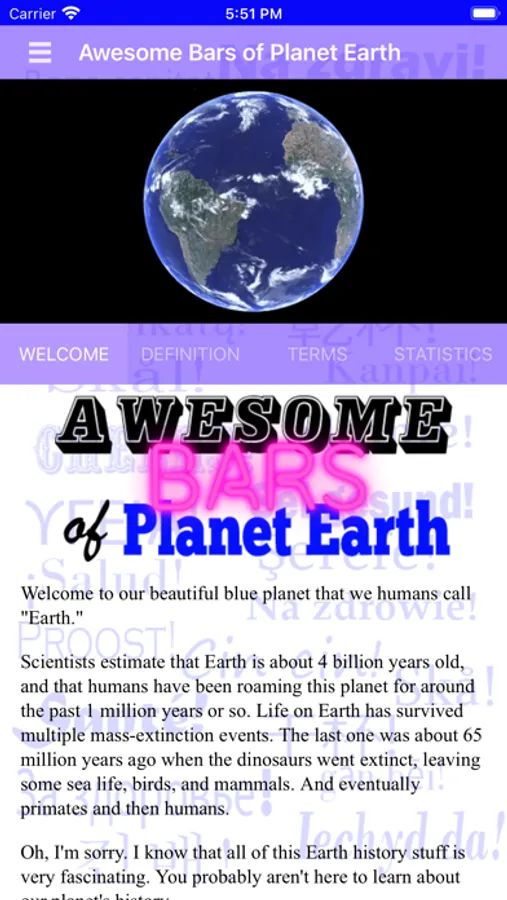 This app is a guide for the travelers that want to stop by the beautiful blue planet for a drink and to have some fun, and even learn some things about the history of humans that inhabit the planet, and their cultures.