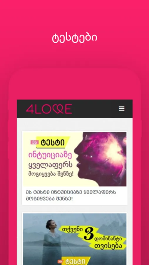Tests - 4LOVE.GE offers a page of tests and quizzes where you will find tests and quizzes of love and not only love content.