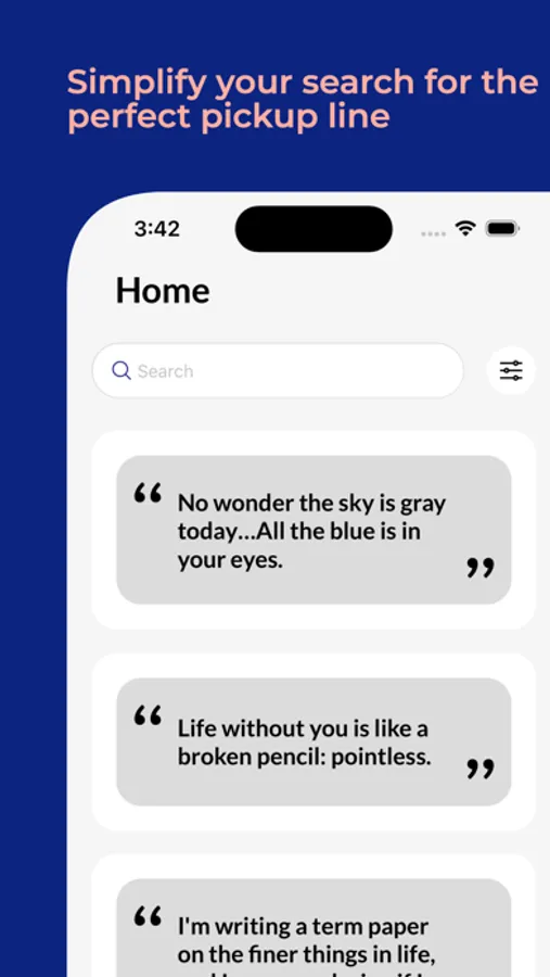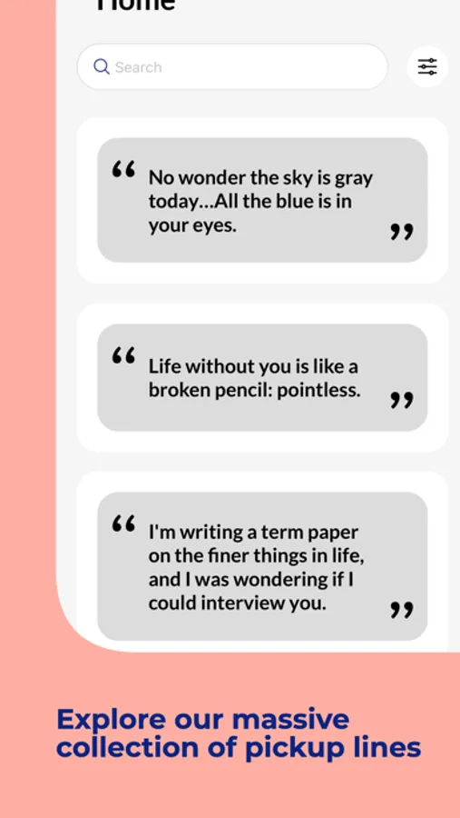 Ice Breaker is the ultimate pickup lines app that helps you break the ice like a pro! With a vast collection of clever, funny and flirty pickup lines, you can easily swipe and match to find the perfect one for any occasion. From cheesy one-liners to smooth moves, Ice Breaker has got you covered. So, whether you're looking to spice up your conversations or find the perfect line for your next date, download Ice Breaker now and start melting the ice today!