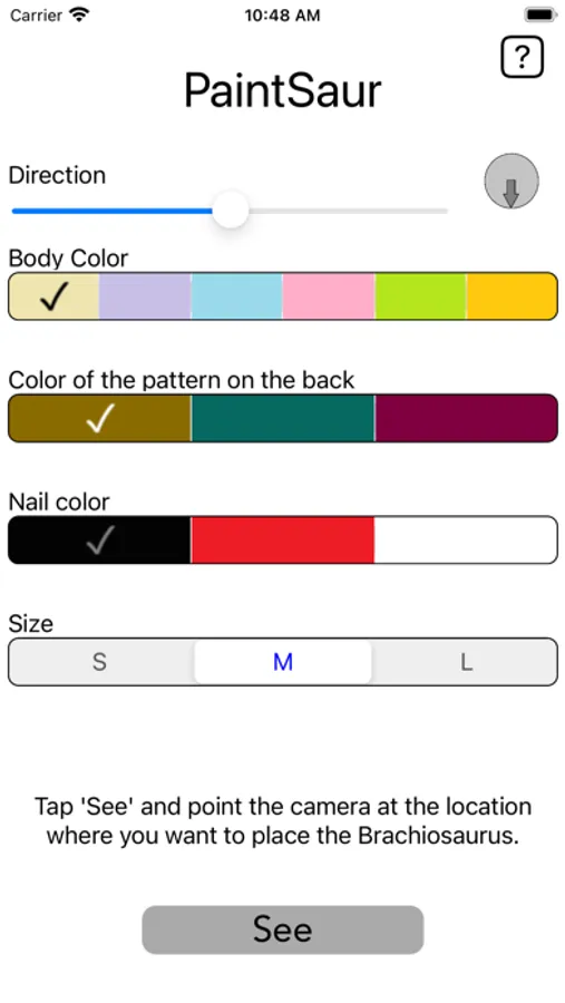 This is an application to experience AR, in which a Brachiosaurus animation of the color of your choice appears in the real world.