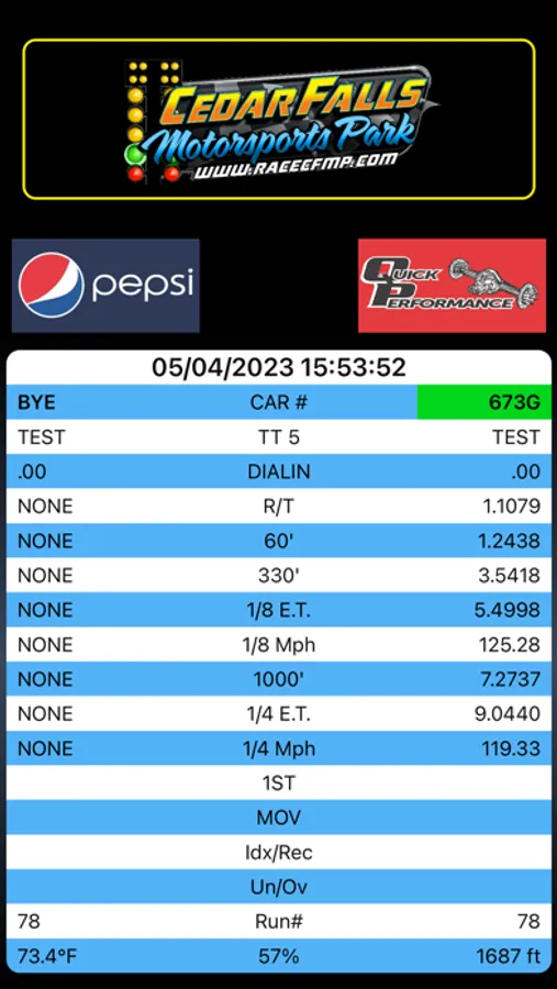 Drag racing Time slips from Cedarfalls Motorsports Park race tracks are currently printed using a receipt printer at the race track. This app shows the same time slips information on your phone.