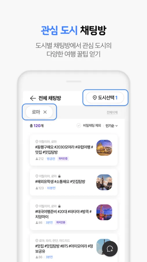 도시별 채팅방으로 관심 도시의 다양한 여행 꿀팁을 얻어 여행을 준비해 보세요.