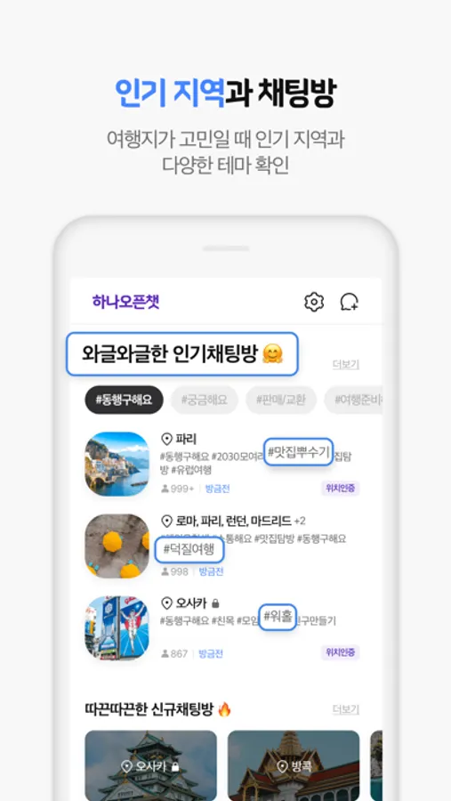 여행지가 고민일 때 인기있는 지역과 다양한 테마의 채팅방을 확인하여 참여 해보세요.