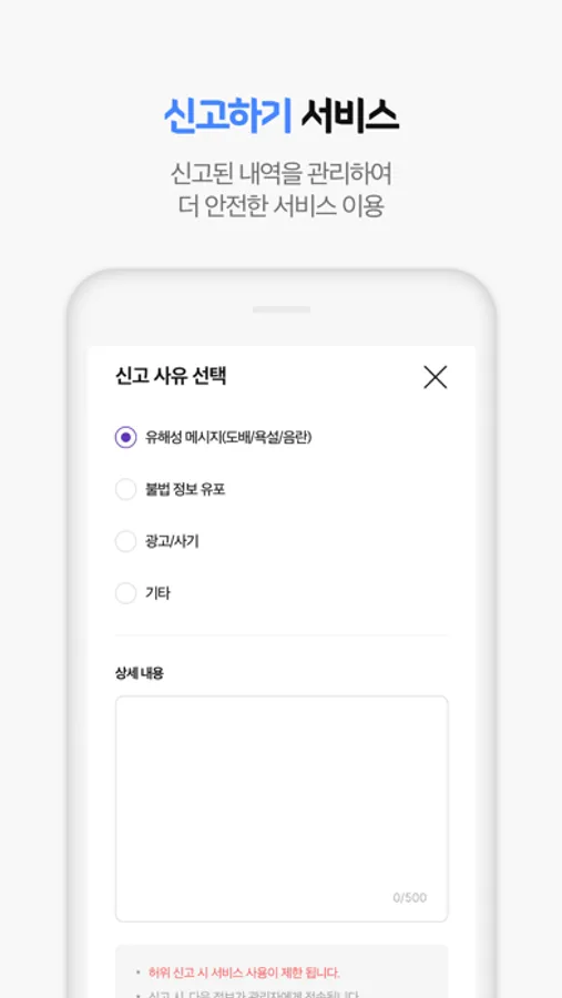 신고된 내역을 통해 운영 관리하여 더 안전하게 서비스 이용이 가능하니 안심 하세요.