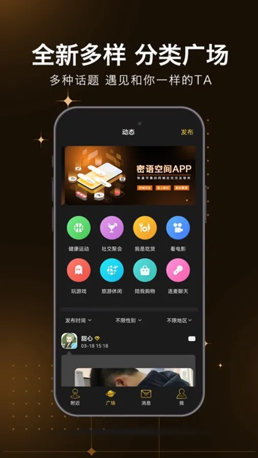 广场页用户可以发动态分享生活中奇闻乐事等,有兴趣的还可以在动态下回复参与互动,丰富生活;