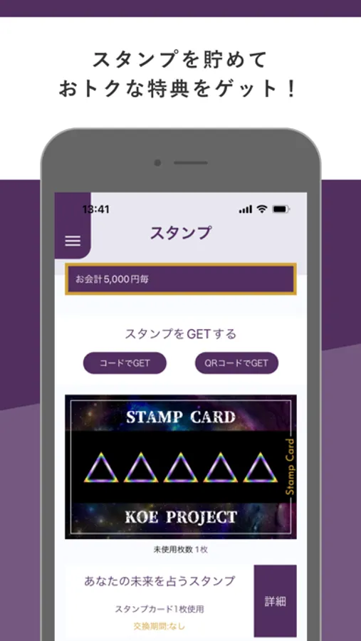 ご来店ごとにスタンプが溜まるスタンプ機能。溜まったスタンプの数に応じてお得な特典が得られます。