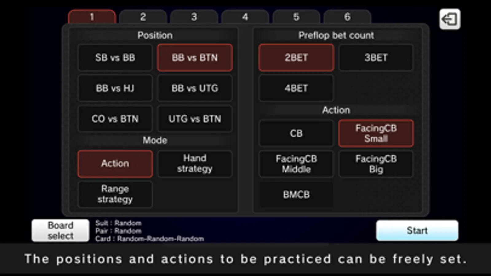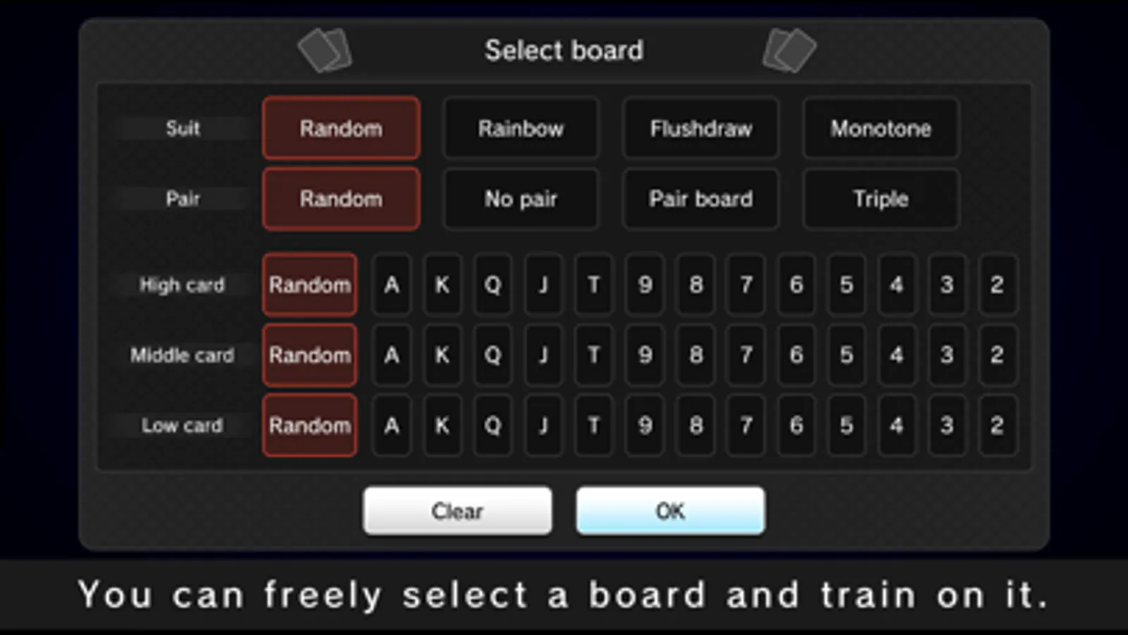 ・Play with your favorite board textures "Monotone Board", "A High Board, etc.", "Pair Board", "Specify all 3 cards"