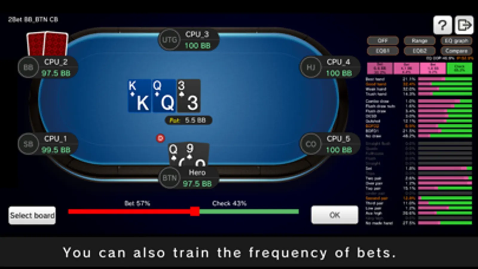 Training is also possible by specifying the frequency of actions as a percentage. For example, it is possible to set betting at 62% frequency and checking at 38% frequency.