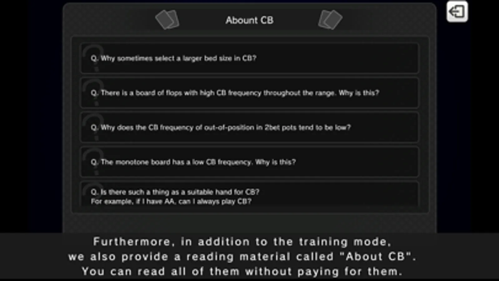 In addition to the training mode, there is also a reading material called "Explanation about CB",