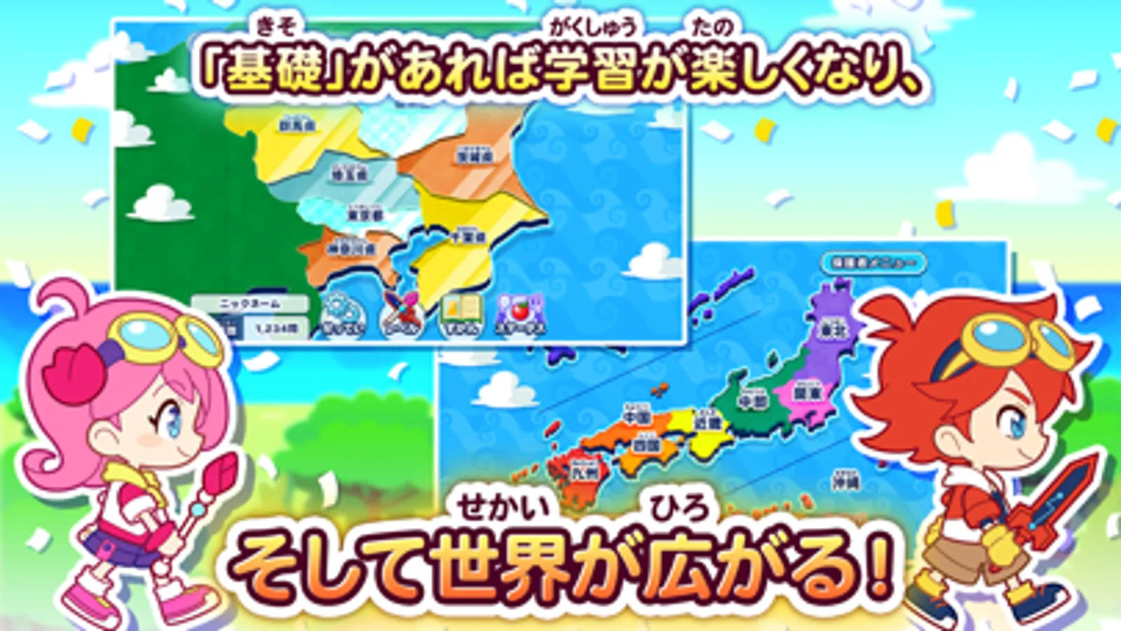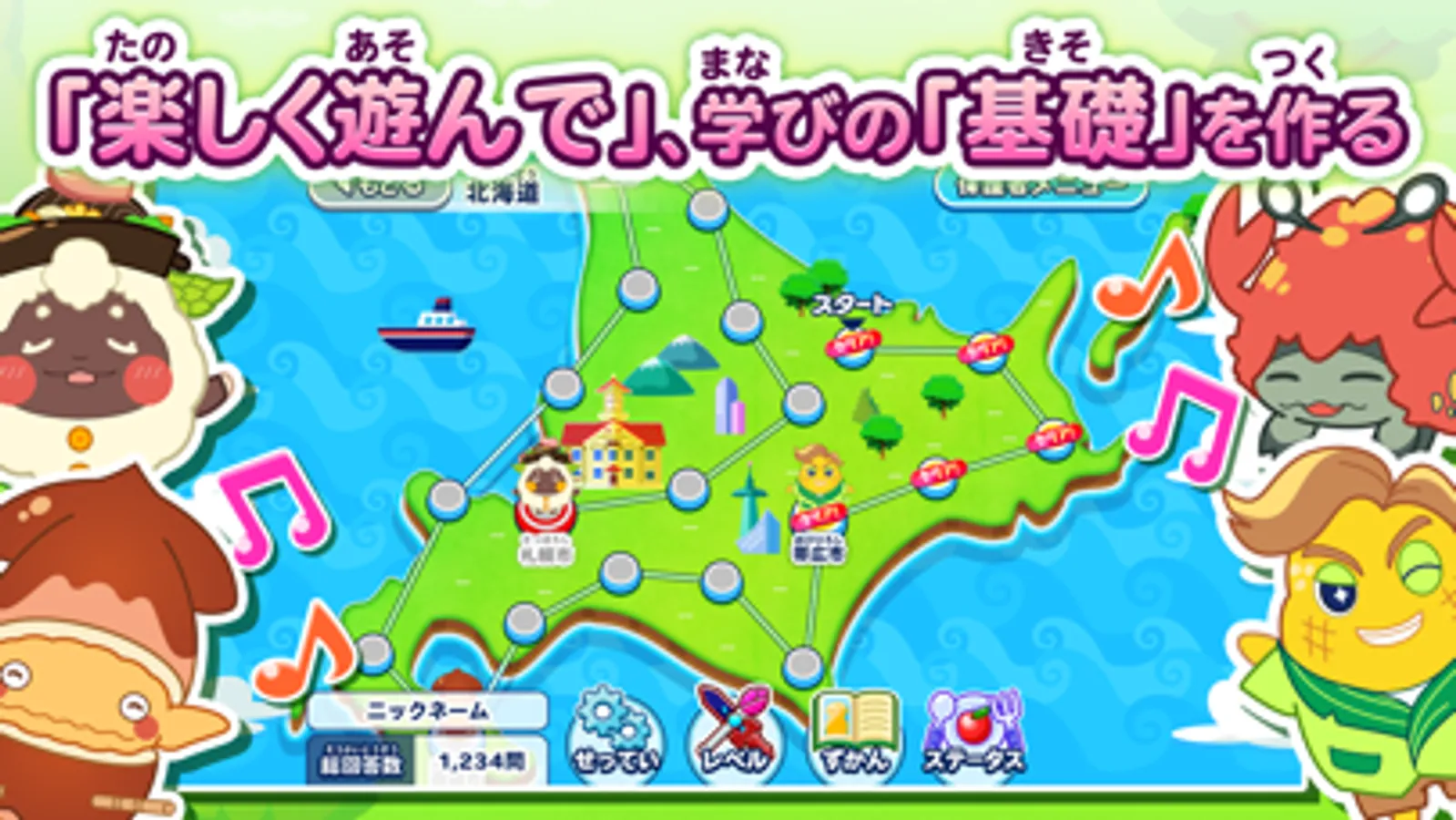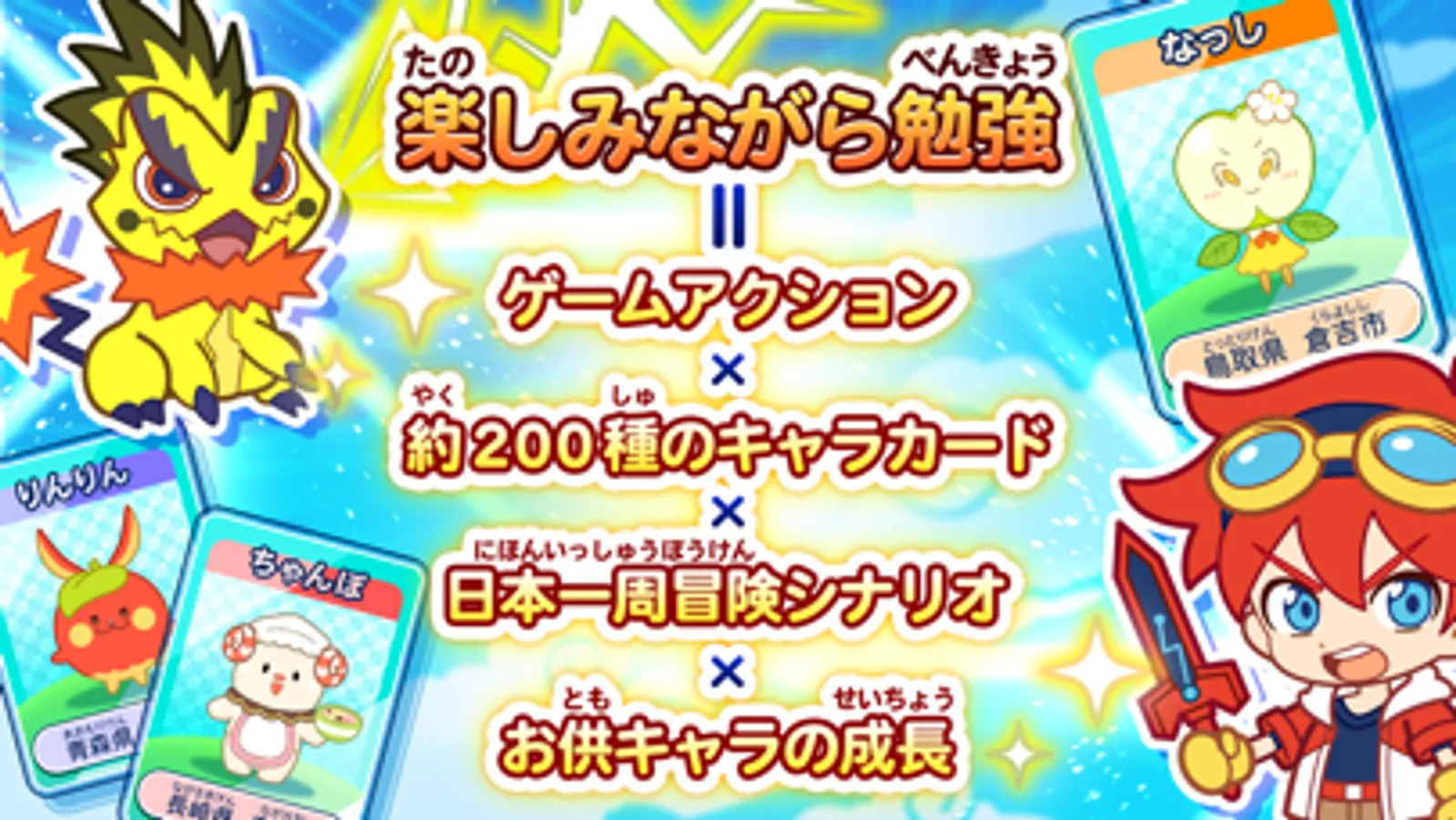 ・200種のキャラカード収集や、日本一周の冒険をしながら、地理や特産物も同時に学べます。