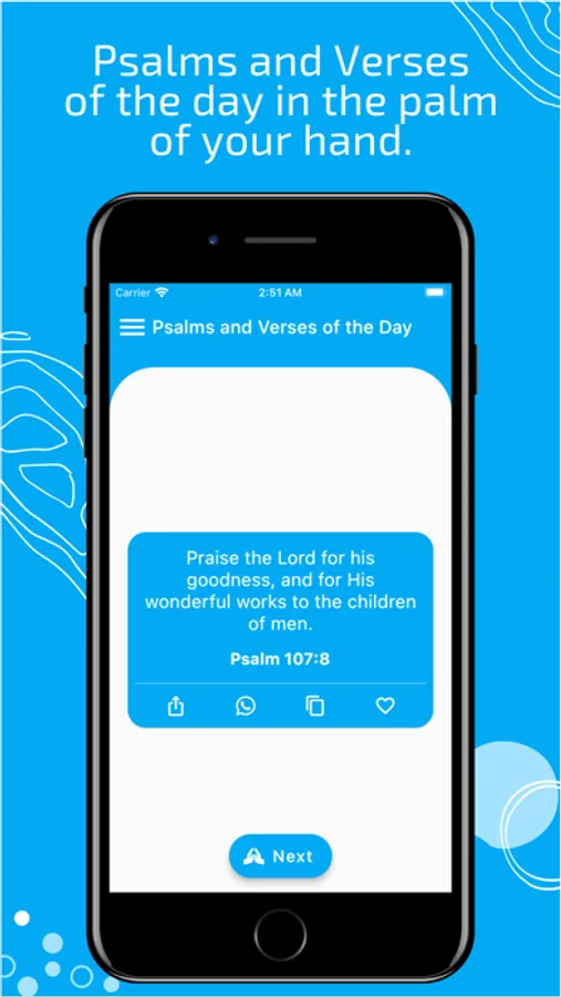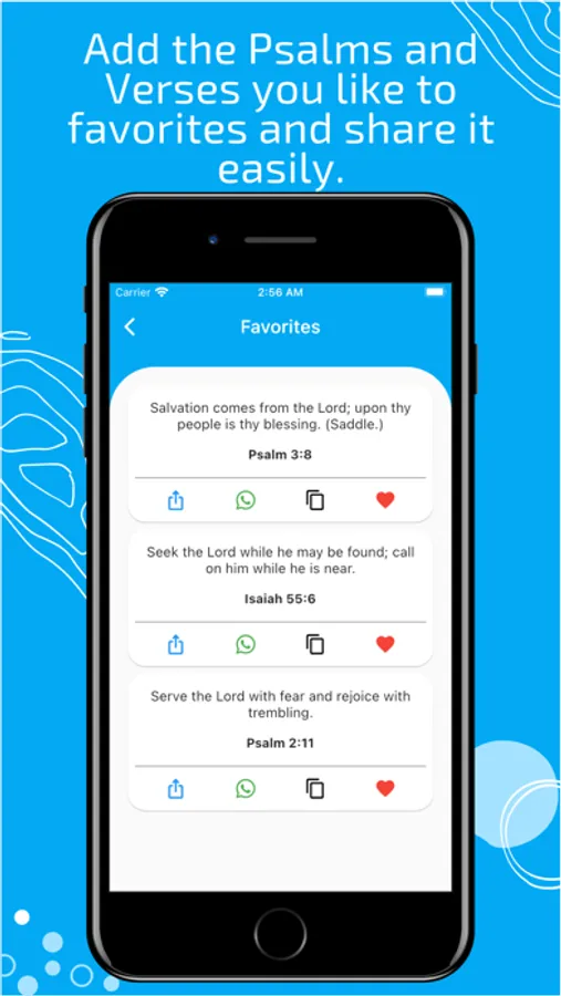 With the app you have access to the Psalms and Verses of Bible and allow you to share it easily with your friends and family.
