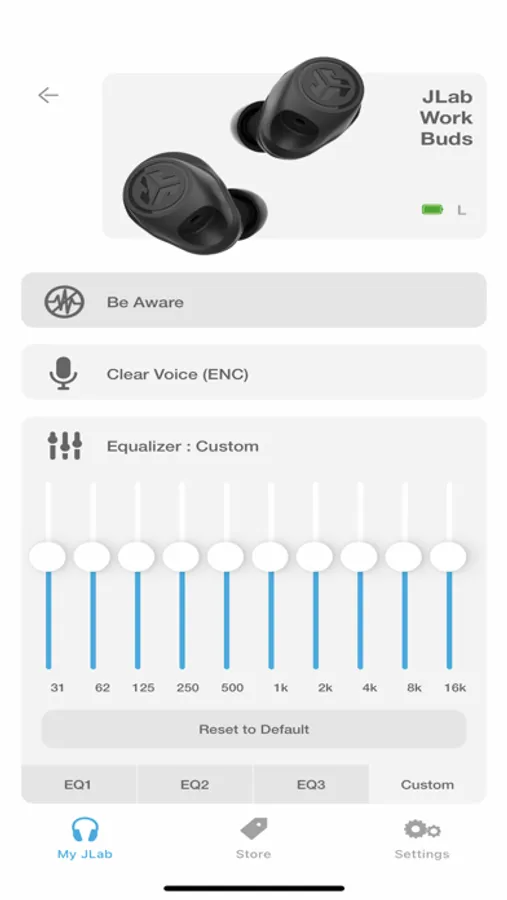 Fine tune your sound by adjusting the equalizer settings. JLab products come set with three default settings - called Custom EQ3 Sound, which features JLab Signature, Balanced and Bass Boost and a 4th option 'Custom'. Use the JLab App to test and set your own equalizer settings by adjusting Bass (200, 280, 400 Hz levels), Mid-Range (550, 770, 1000, 2000 Hz levels) and Treble (4000, 8000, 16000 Hz levels).