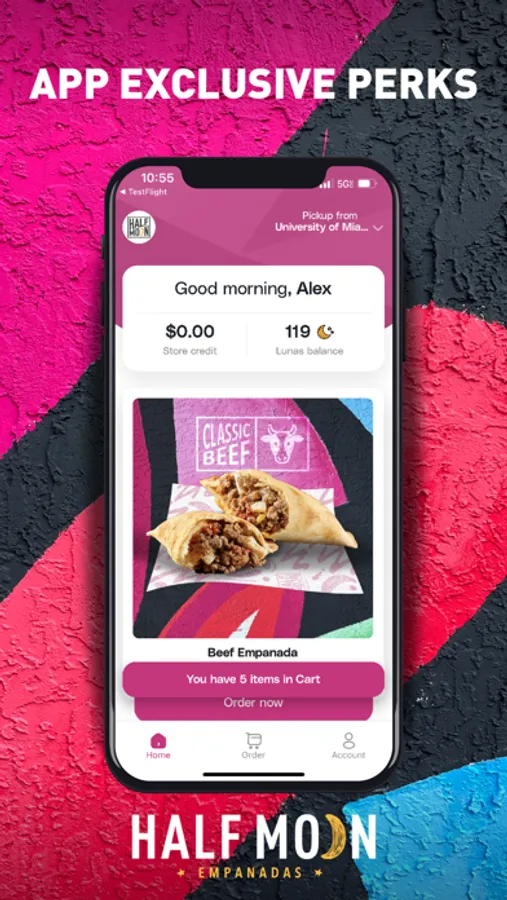 Your gateway to flavorful convenience, whether you want to order ahead for pickup, pay in-store, or customize your favorite drink and empanada delights. With our Half Moon Rewards Program built right in, you'll collect Lunas towards free food and drinks with every purchase.